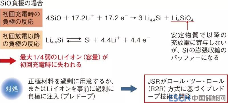 在許多Si基負(fù)極中,電池中的一部分Li離子與負(fù)極材料在初始充電時(shí)發(fā)生反應(yīng)并固化,因此存在容量大幅下降的問題。作為對(duì)策,存在Li離子的預(yù)摻雜。JSR和其他公司已經(jīng)開發(fā)出Li離子預(yù)摻雜的技術(shù)。