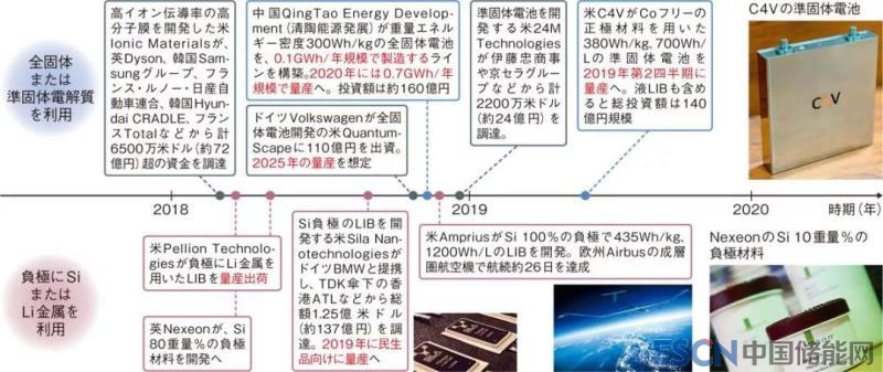 為了(1)中提到的面向EV的全固態(tài)電池,來自全世界的千百億日元規(guī)模的資金集中到某些海外風(fēng)險(xiǎn)公司(大部分在美國)。最近中國企業(yè)也有參與,例如中國的隔膜制造商清陶能源,宣布將新建一條全固態(tài)生產(chǎn)線,在2018年末達(dá)到0.1Gwh,并且在2020年達(dá)到0.7GWh。目前,待批量生產(chǎn)的電池的重量能量密度最初為300Wh / kg。然而目前已經(jīng)在實(shí)驗(yàn)室實(shí)現(xiàn)了400Wh/kg,并且將逐漸在量產(chǎn)中實(shí)現(xiàn)這一目標(biāo)。