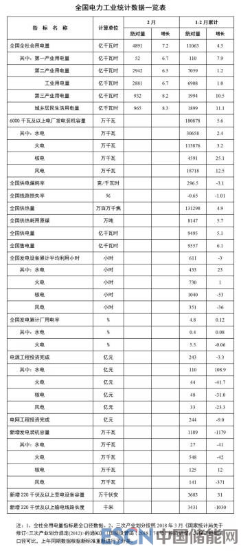 1-2月,全社會用電量累計11063億千瓦時,同比增長4.5%。分產(chǎn)業(yè)看,第一產(chǎn)業(yè)用電量110億千瓦時,同比增長7.9%;第二產(chǎn)業(yè)用電量7059億千瓦時,同比增長1.2%;第三產(chǎn)業(yè)用電量1994億千瓦時,同比增長10.5%;城鄉(xiāng)居民生活用電量1899億千瓦時,同比增長11.1%。