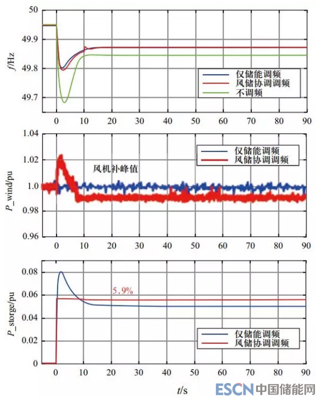 基于本文所提風儲協(xié)同調(diào)頻控制策略,模擬風電裝機容量占比為20%的電力系統(tǒng)中發(fā)生5%功率缺額事件后,在6.2 m/s,8.6 m/s和11.2 m/s 3種風速條件下時儲能系統(tǒng)的調(diào)頻容量需求,仿真得到風速11.2 m/s時儲能容量需求最多,為風電場裝機容量的5.9%,相比儲能單獨承擔調(diào)頻任務時8% pu時減少了26%。