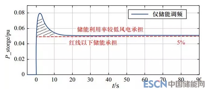 由于一次調(diào)頻所需虛擬慣量具有尖峰特征,若僅由儲能提供一次調(diào)頻附加功率,儲能峰值功率利用時間短,功率利用率低,由此提出風電轉(zhuǎn)子慣量釋放和儲能穩(wěn)態(tài)支撐的協(xié)調(diào)控制策略:虛擬慣量等短時功率尖峰由風電承擔,一次調(diào)頻所需要的穩(wěn)態(tài)功率由儲能承擔,如圖8所示。