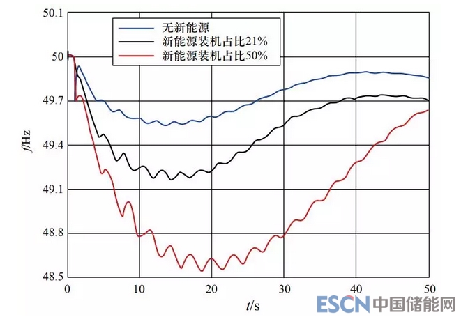 1)若新能源機組不具備一次調(diào)頻功能,隨著新能源裝機占比的提升,電網(wǎng)對功率突變事件的抗干擾能力將被大大削弱,頻率特性嚴重惡化;