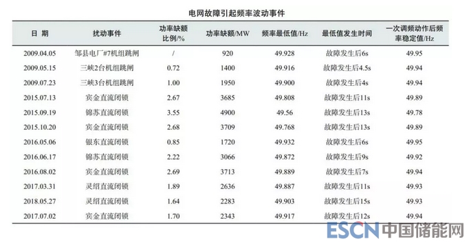 為研究系統(tǒng)在功率缺額情況下電網(wǎng)的頻率特性,統(tǒng)計了近十年內(nèi)中國電力系統(tǒng)中較嚴重的頻率波動事件??梢园l(fā)現(xiàn):功率缺額較小時(3%pu以內(nèi)),頻率降低值與缺額值成正比關(guān)系,1%的功率缺額將導致系統(tǒng)頻率最低點下降約0.08Hz,頻率最低值出現(xiàn)的時間在故障發(fā)生后的10s之內(nèi);功率缺額較大時,單位功率缺額引起的頻率最低點下降越嚴重,最低點出現(xiàn)的時間越晚。