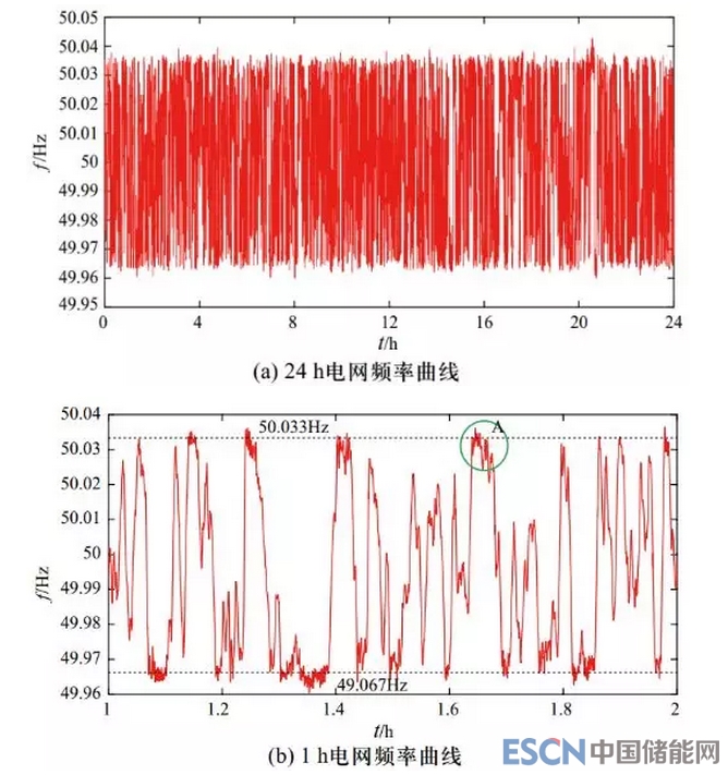 對華北電網(wǎng)某35kV母線PMU頻率數(shù)據(jù)進行長期統(tǒng)計,隨機抽取一天頻率如圖(a)所示,看出該地區(qū)電網(wǎng)正常運行工況下頻率波動范圍在 50±0.04Hz以內(nèi),頻率日越過火電機組調(diào)頻死區(qū)±0.033 Hz的總次數(shù)為1670次,其中越上限720次,越下限950次;圖(b)為其中1小時的頻率曲線,觀察圖中A區(qū)域,當電網(wǎng)頻率越過一次調(diào)頻死區(qū)上限,地區(qū)火電機組一次調(diào)頻功能啟動,頻率被調(diào)整回正常范圍。