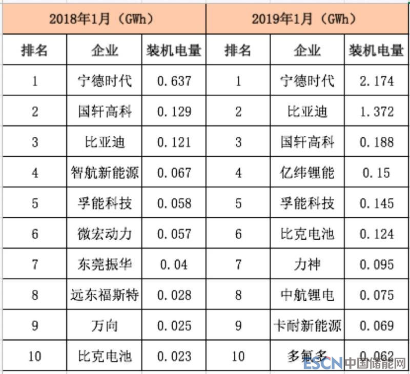 數(shù)據(jù)顯示,2019年1月份裝機(jī)總電量排名前十動力電池企業(yè)合計約4.45GWh,占整體的89%。較2018年排名前十的企業(yè)合計占比上升6個百分點(diǎn),市場集中度提升趨勢明顯。