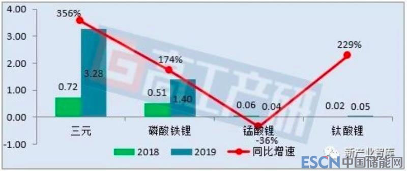 從電池類型來看,2019年1月磷酸鐵鋰電池裝機(jī)電量約1.40GWh,同比增長174%;三元電池裝機(jī)電量約3.28GWh,同比增長356%;錳酸鋰電池裝機(jī)電量約0.04GWh,同比下降36%;鈦酸鋰電池裝機(jī)電量約0.05GWh,同比增長229%。