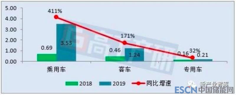 從車型來看,2019年1月新能源乘用車電池裝機(jī)電量約3.53GWh,同比增長411%;客車電池裝機(jī)電量約1.24GWh,同比增長171%;專用車電池裝機(jī)電量約0.21GWh,同比增長32%。
