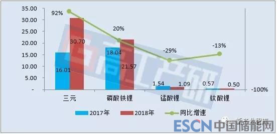 從不同電池類型來(lái)看,2018年磷酸鐵鋰電池裝機(jī)電量約21.57GWh,同比增長(zhǎng)20%;三元電池裝機(jī)電量約30.70GWh,同比增長(zhǎng)92%;錳酸鋰電池裝機(jī)電量約1.09GWh,同比下降29%;鈦酸鋰電池裝機(jī)電量約0.50GWh,同比下降13%。