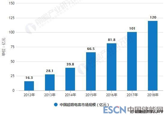 據(jù)前瞻產(chǎn)業(yè)研究院發(fā)布的《中國超級電容器行業(yè)發(fā)展前景預測與投資戰(zhàn)略規(guī)劃分析報告》統(tǒng)計數(shù)據(jù)顯示,2012年中國超級電容器市場規(guī)模僅僅為16.3億元,2015年中國超級電容器市場規(guī)模增長至66.5億元。到了2016年中國超級電容器市場規(guī)模達到81.8億元。截止至2017年中國超級電容器市場規(guī)模突破百億元。前瞻產(chǎn)業(yè)研究院預計2018年中國超級電容器市場規(guī)模將達120億元。