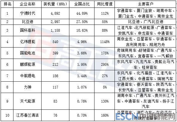 2018年前三季度磷酸鐵鋰裝機(jī)量TOP10企業(yè)