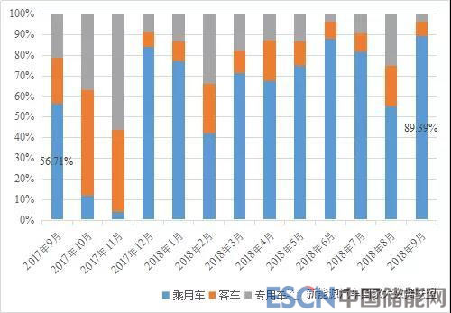 圖2 2017年9月份~2018年9月份不同類別新能源汽車接入量占比示意圖
