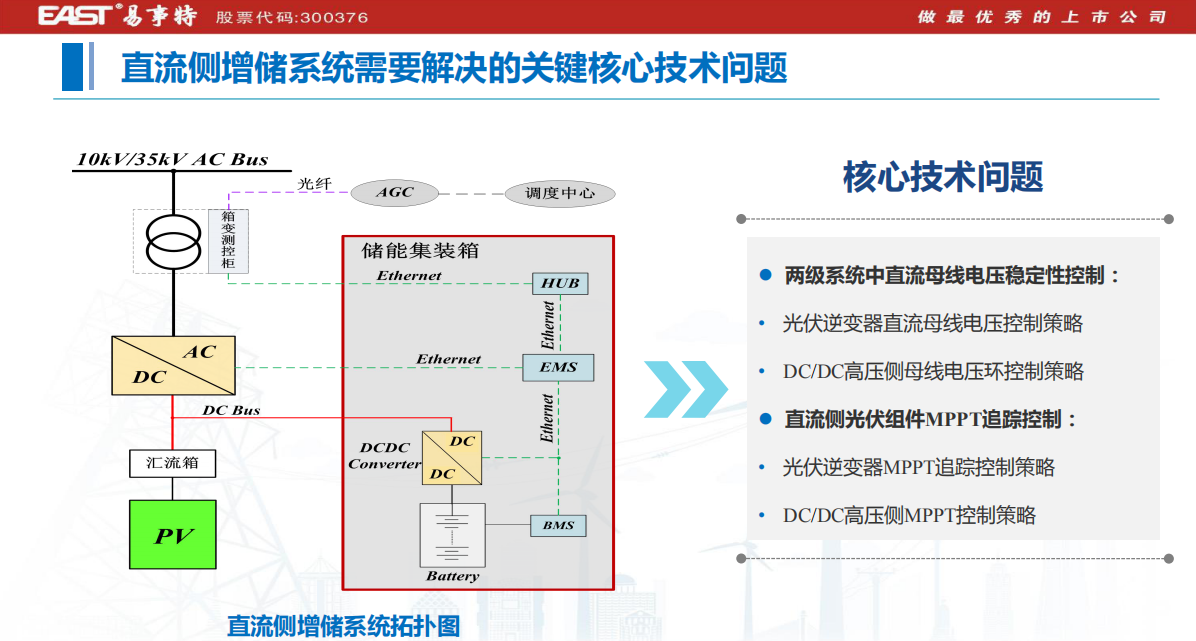 在原有的光伏系統(tǒng)的直流側(cè)增加儲(chǔ)能系統(tǒng),基于此核心的配置在現(xiàn)有的基礎(chǔ)上把我們的儲(chǔ)能,包括DC雙向變換器、監(jiān)控系統(tǒng)等加進(jìn)去,我們要側(cè)重于哪個(gè)方面呢?基于光伏電站直流側(cè)增儲(chǔ)控制策略,要對(duì)棄光電量進(jìn)行一個(gè)可控的管理。我們的監(jiān)控系統(tǒng)、能量管理系統(tǒng)和發(fā)指令的速度,關(guān)于AGC下發(fā)的光伏限發(fā)指令,基于此,我們遇到兩個(gè)問(wèn)題,在原有的光伏發(fā)電系統(tǒng),把儲(chǔ)能加進(jìn)去之后價(jià)格就變了,從原來(lái)組建的發(fā)電系統(tǒng)變成了儲(chǔ)能電池組或者DC/DC高壓側(cè)系統(tǒng),這樣要把儲(chǔ)能的工作和責(zé)任分清楚。比如光伏直變器只管發(fā),對(duì)于母線的控制誰(shuí)去管?這些方面的問(wèn)題是需要解決的,這些問(wèn)題解決不了,在光伏電站儲(chǔ)能的方面會(huì)出現(xiàn)這樣那樣的問(wèn)題。在這里面兩級(jí)系統(tǒng)中直流母線電壓穩(wěn)定性控制是需要考慮到的問(wèn)題。