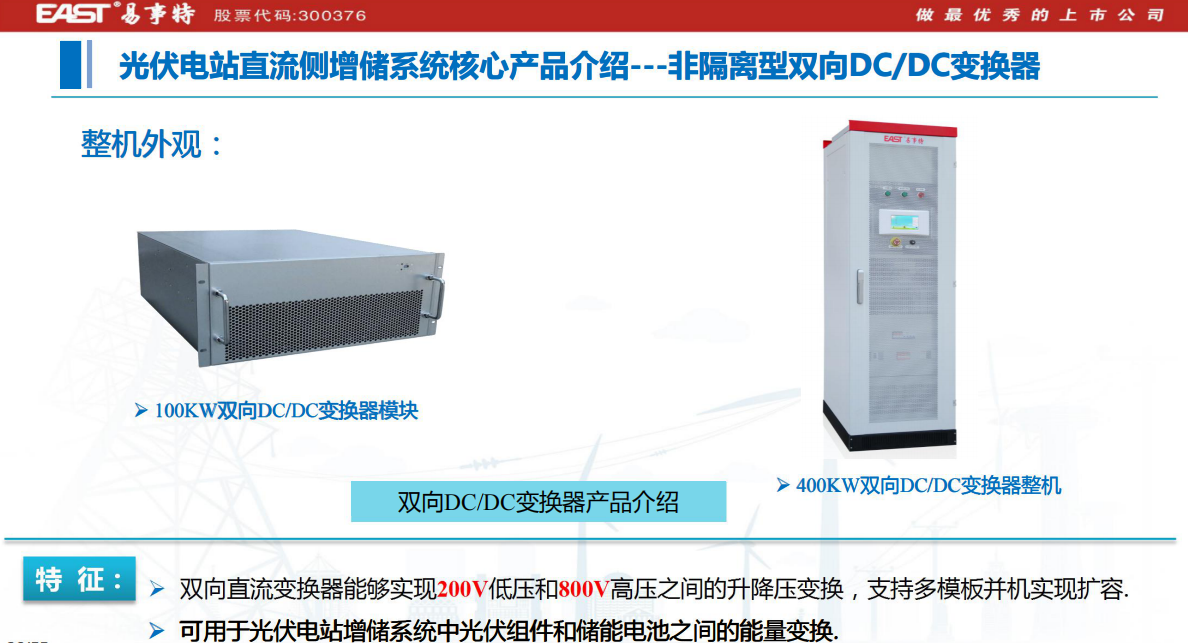 對(duì)光伏逆變器做一個(gè)恒定的并網(wǎng)功率輸出,把所有母線控制全部交給DC/DC去完成。這樣相對(duì)把軟件做一個(gè)稍微的修改,便于整個(gè)工程項(xiàng)目的交付。從這些來(lái)看,并網(wǎng)限發(fā)和充放的功率還是比較高的,從實(shí)際運(yùn)行情況曲線是吻合的,你浪多少能量會(huì)原封不動(dòng)的保存起來(lái),在光照組件不夠的情況下,會(huì)從電池組里釋放出來(lái),這就會(huì)進(jìn)行一個(gè)充放電智能的協(xié)調(diào)。這里面關(guān)鍵的核心測(cè)試平臺(tái),包括對(duì)變換器的控制方面進(jìn)行了一些很強(qiáng)的技術(shù)儲(chǔ)備和運(yùn)行經(jīng)驗(yàn)。我們主要的核心產(chǎn)品是100KU雙向DC/DC變換器模塊,可以實(shí)現(xiàn)雙向直流變換器200V低壓和800V高壓之間的升降壓變換,支持多模塊并機(jī)實(shí)現(xiàn)的擴(kuò)容,可用于光伏電站增儲(chǔ)系統(tǒng)中光伏組件和儲(chǔ)能電池之間的能量變換。目前我們給北京現(xiàn)代一個(gè)客戶做的方案證明還是非常合適的。我們?cè)趯幭淖龅陌咐齺?lái)看,DC/DC變換器運(yùn)行的實(shí)驗(yàn)波行還是可以的。這樣可以確保在實(shí)際的工程應(yīng)用中,對(duì)大系統(tǒng)的影響是最小的。
