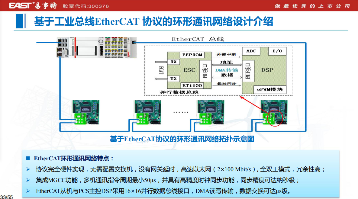 基于工業(yè)總線EtherCAT協(xié)議的環(huán)行通訊網(wǎng)絡(luò)設(shè)計(jì),協(xié)議完全硬件實(shí)現(xiàn),無(wú)需配置交換機(jī),沒有網(wǎng)關(guān)延時(shí),高速以大網(wǎng)、全雙工模式,冗余性高。并且有高精度時(shí)鐘同步功能,同步精度可達(dá)納秒級(jí)。我發(fā)一個(gè)指令變流器接收到以后響應(yīng)的時(shí)間有多少呢?這對(duì)于風(fēng)電廠的運(yùn)營(yíng)單位是比較關(guān)心的,0.11秒就可以達(dá)到,這是我們測(cè)試的結(jié)果。