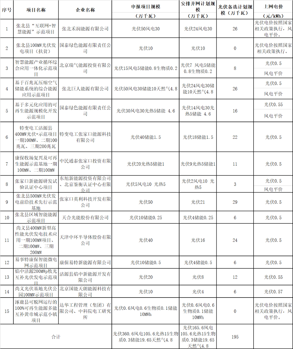 2.張北縣“互聯(lián)網(wǎng)+智慧能源”示范項(xiàng)目為國家能源局先期批復(fù)的示范項(xiàng)目,并承擔(dān)一定的扶貧任務(wù);張北縣100MW光伏發(fā)電項(xiàng)目(扶貧)為光伏扶貧示范項(xiàng)目;涿鹿縣可脫網(wǎng)運(yùn)行的100%可再生能源多能互補(bǔ)黃帝城示范小鎮(zhèn)項(xiàng)目為中科院與張家口市合作的A類先導(dǎo)專項(xiàng),且規(guī)模較小,以上三個(gè)項(xiàng)目光伏上網(wǎng)電價(jià)按并網(wǎng)時(shí)當(dāng)?shù)毓夥鼧?biāo)桿上網(wǎng)電價(jià)執(zhí)行。其余光伏項(xiàng)目按承諾電價(jià)執(zhí)行;若屆時(shí)承諾的上網(wǎng)電價(jià)高于并網(wǎng)電價(jià)標(biāo)準(zhǔn),按照最新電價(jià)政策執(zhí)行。