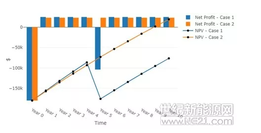 圖4.兩個項目的現(xiàn)金流量。藍色線條表示采用一種更積極的策略,沒有考慮退化,但獲得更多收入。橙色線條表示采用了更為保守的策略,可以減少退化。