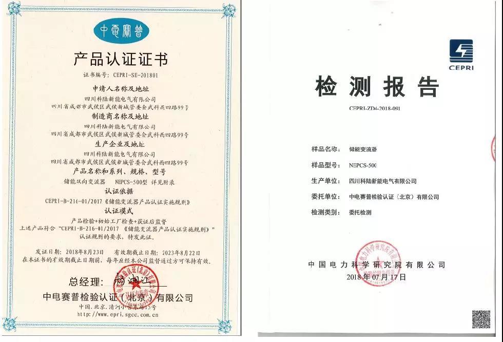 8月23日,由深圳市科陸電子科技股份有限公司(以下簡稱“科陸”)全資子公司——四川科陸新能電氣有限公司研制的儲能變流器NEPCS-500和NEPCS-250,獲得中國電力科學(xué)研究院(以下簡稱“中國電科院”)和中電賽普檢驗認證(北京)有限公司(以下簡稱“中電賽普”)頒發(fā)的國內(nèi)首張儲能變流器產(chǎn)品認證證書,標(biāo)志科陸儲能變流器已引領(lǐng)行業(yè)尖端技術(shù)水平。