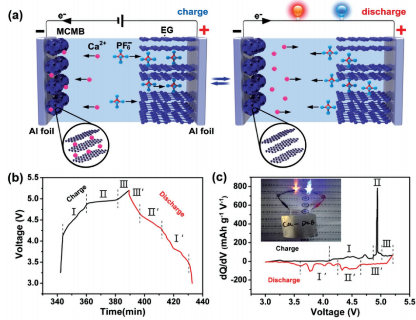 鑒于此,唐永炳及其團隊成員吳石、張帆等人成功研發(fā)出一種基于雙碳結構的鈣型雙離子電池。該電池材料廉價易得并且環(huán)保,采用膨脹石墨作為正極材料,PF6-陰離子可以在其片層結構中可逆地嵌入/脫出;采用中間相碳微球作為負極材料,Ca2+可以在其片層結構中可逆地嵌入/脫出。電解液采用基于六氟磷酸鈣做電解質的碳酸酯類電解液。研究表明,該鈣型雙離子電池可以在室溫下實現(xiàn)可逆充放電,并且表現(xiàn)出優(yōu)異的電化學性能:平均工作電壓高達4.6V,1C倍率下循環(huán)300圈后容量保持率為94%。這種新型鈣離子電池結構設計為鈣離子電池的研究開拓了新思路,也為基于多價金屬離子電池的研究提供了借鑒意義。