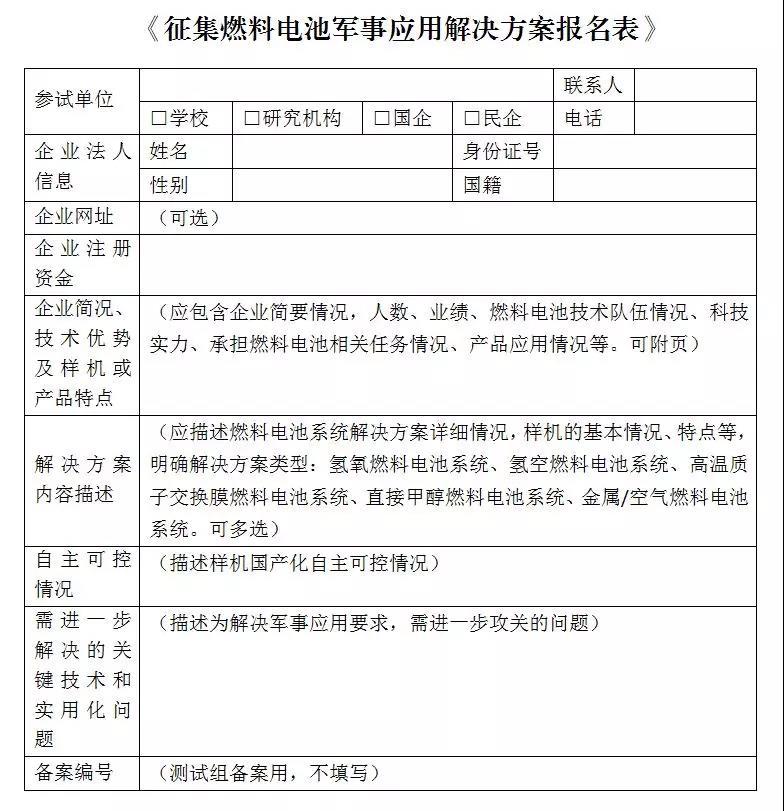 填寫《征集燃料電池軍事應用解決方案報名表》(附后),發(fā)送電子郵件至songshuang_1021@126.com。報名聯(lián)系人及電話:宋爽,17720519646。