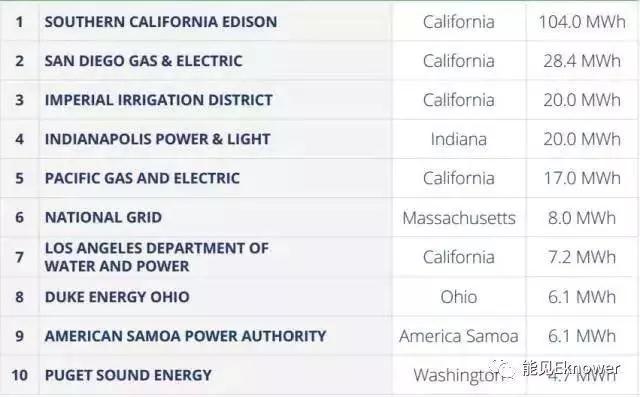 表1 2016年美國公用事業(yè)公司儲能安裝容量排名