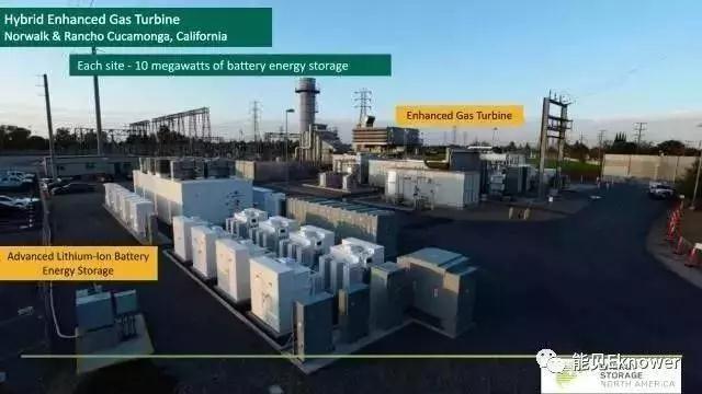 2016年起,南加州愛迪生公司(SCE)開始嘗試儲能與傳統(tǒng)發(fā)電機(jī)組聯(lián)用的新型應(yīng)用模式。2017年4月,SCE、GE、Wellhead Power Solutions合作安裝運(yùn)行了全球首個燃?xì)廨啓C(jī)-儲能混合發(fā)電系統(tǒng)(Hybrid Enhanced Gas Turbine,Hybrid EGT)。該系統(tǒng)安裝于Norwalk & Rancho Cucamonga配電站,包括50MW燃?xì)廨啓C(jī)和11MW/4.3MWh電池儲能系統(tǒng)。