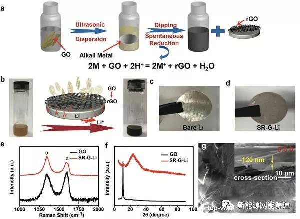 上圖展示了石墨烯涂層金屬鋰負極的制備過程,首先將氧化石墨烯分散在四氫呋喃(THF)中,然后將金屬鋰放入到上述的分散液之中,我們能夠觀察到溶液的顏色逐漸從棕色轉(zhuǎn)變?yōu)楹谏?,表明溶液中的氧化石墨烯逐漸轉(zhuǎn)變了還原石墨烯,還原的石墨烯沉積在金屬Li的表面,形成一層保護層。通過控制金屬Li在氧化石墨烯分散液中的反應(yīng)時間,能夠有效的控制金屬鋰負極表面的石墨烯層的厚度,從而獲得最佳的電化學(xué)性能。