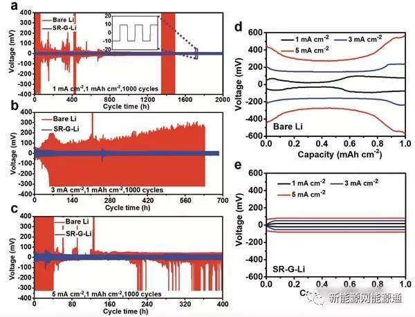從下圖d和e中我們對比在不同的電流密度下金屬Li負極的電壓平臺能夠發(fā)現(xiàn),當電流密度從1mA/cm2提高到5mA/cm2,沒有石墨烯涂層的金屬Li負極電壓平臺從54.3mV大幅增大到了449.2mV,而采用石墨烯涂層保護的金屬Li負極僅僅從19.2mV增加到79.3mV,表明石墨烯涂層能夠顯著的降低金屬Li負極的極化。