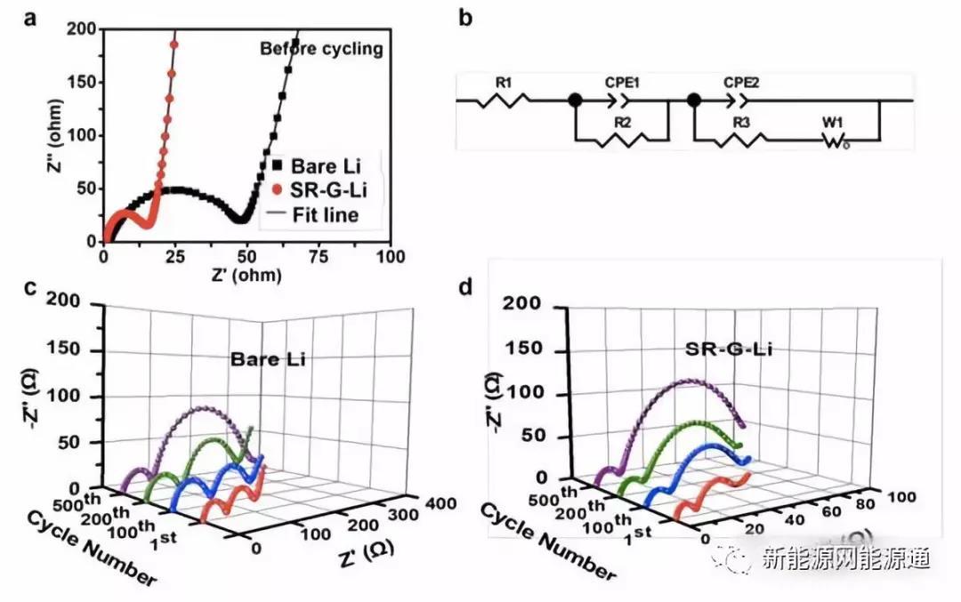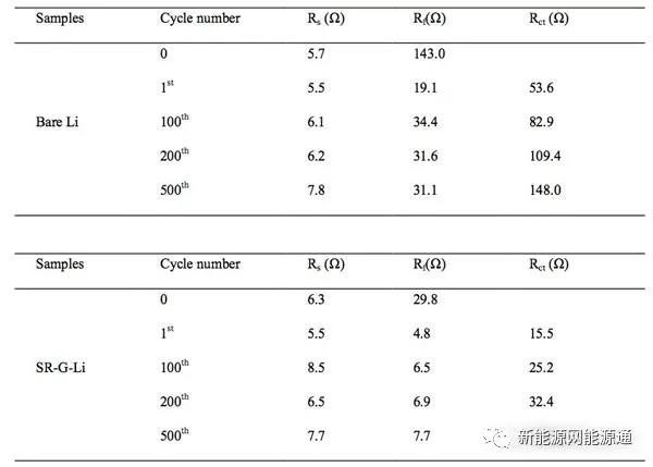 石墨涂層提升金屬Li負極循環(huán)性能的原因能夠從EIS分析中得到,通過對比在1mA/cm2的電流密度下循環(huán)1,100,200和500次的EIS測試結(jié)果,我們能夠發(fā)現(xiàn)石墨烯涂層的金屬Li負極表面SEI膜阻抗Rf和電荷交換阻抗RCT要明顯低于沒有涂層的,并且循環(huán)過程中有石墨烯涂層保護的金屬Li負極的阻抗增加速度也要明顯慢于普通的金屬Li負極,表明石墨烯涂層能夠幫助金屬Li負極形成更加穩(wěn)定的SEI膜,減緩循環(huán)過程中SEI膜的生長。