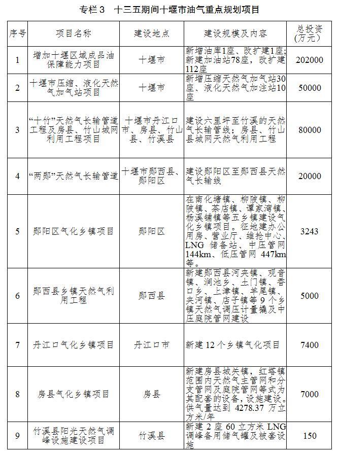 4、成品油輸送通道。建設襄陽—十堰成品油管道工程,該工程已納入《湖北省能源發(fā)展“十三五”規(guī)劃》。
