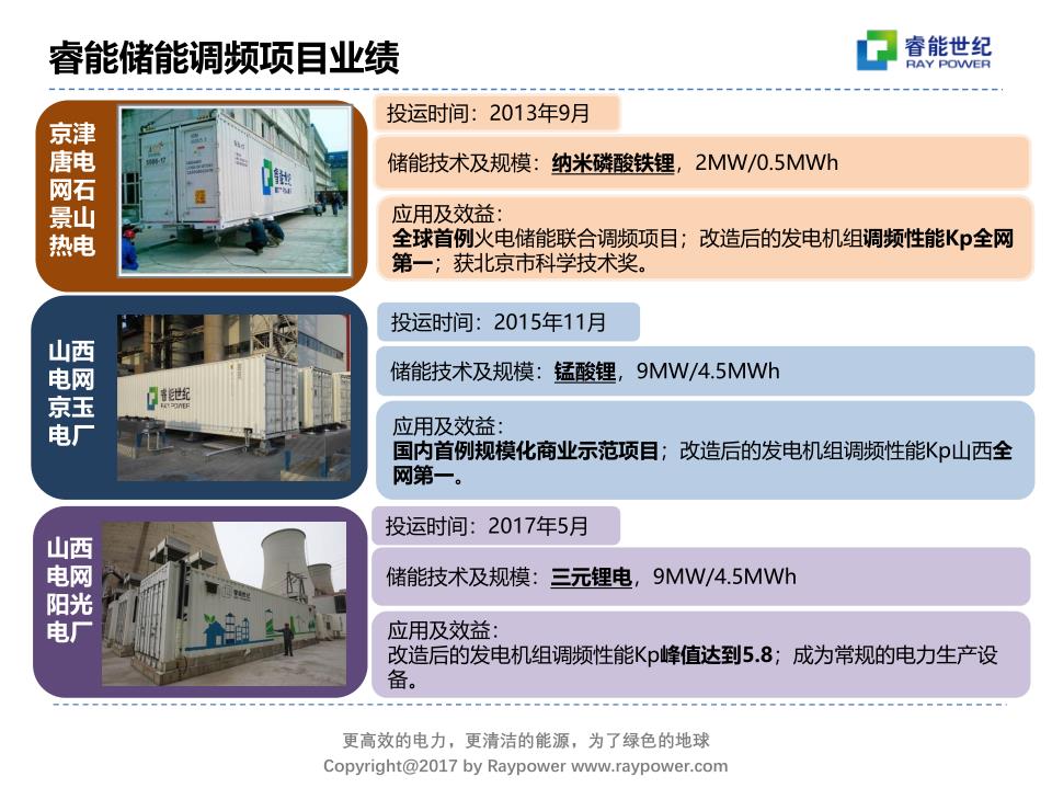 睿能2011年成立提出這個業(yè)務(wù)的構(gòu)想,在2013年有第一個項目落地,這也是全國第一個儲能火電聯(lián)合調(diào)頻的項目。這個項目在北京石景山熱電,用2MW/0.5MWh的儲能,配一個22萬的機組。當(dāng)時我們用的系統(tǒng)是美國A123公司納米磷酸鐵鋰電池。這個項目是比較成功的示范項目,當(dāng)時我們做出來之后,這臺機組加了儲能之后,調(diào)頻性能能夠做到京津唐電網(wǎng)第一名。