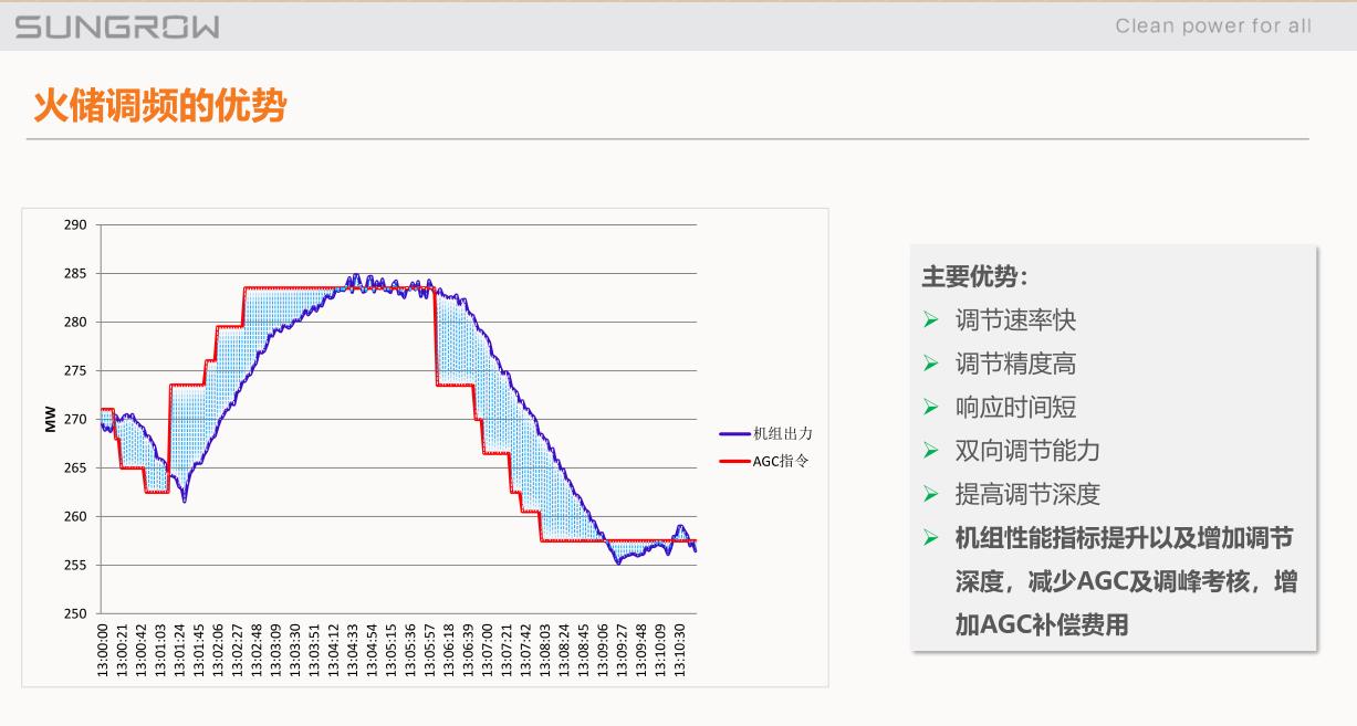 這是一個(gè)典型的火電廠進(jìn)行火儲(chǔ)聯(lián)合調(diào)頻的方案。儲(chǔ)能系統(tǒng)加在哪兒?就在這里。整個(gè)儲(chǔ)能系統(tǒng)的加入完全不影響原來的火電機(jī)組的實(shí)際運(yùn)行,通過先進(jìn)的EMS管理系統(tǒng),計(jì)算出AGC下達(dá)的指令,和火電機(jī)組實(shí)際的出力,把差值的指令送給儲(chǔ)能系統(tǒng),讓儲(chǔ)能系統(tǒng)進(jìn)行充電和放電,從而使整個(gè)火電機(jī)組的出力加上儲(chǔ)能系統(tǒng)的出力,能夠有效地和AGC匹配。