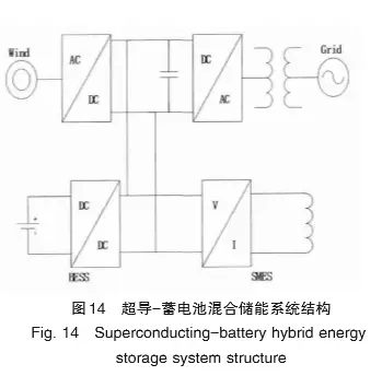 目前研究較多的SMES混合儲能主要是超導(dǎo)-蓄電池混合儲能。超導(dǎo)-蓄電池混合儲能是將SMES與電池儲能系統(tǒng)(batteryenergystoragesystem,BESS)相結(jié)合的一種混合儲能裝置。它采用共直流母線的結(jié)構(gòu),風(fēng)機(jī)通過變流器和變壓器連接到電網(wǎng),SMES和BESS通過各自的DC/DC斬波器連接到直流母線上(圖14)。