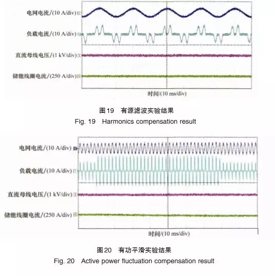 為了評估該SMES的性能,對其進(jìn)行了實(shí)驗(yàn)和并網(wǎng)測試。圖19是其有源濾波的實(shí)驗(yàn)波形,自上至下依次為電網(wǎng)電流、負(fù)載電流、直流母線電壓和儲能線圈電流。