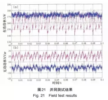 圖20是有功平滑的實(shí)驗(yàn)結(jié)果。在實(shí)驗(yàn)過程中,非線性負(fù)載的功率由50kW跳變到100kW后跳變回50kW。在負(fù)荷突增時,儲能線圈的電流從300A下降到260A,從而為突增的負(fù)荷提供突變的有功功率;而在負(fù)荷突降時,儲能線圈從電網(wǎng)吸收有功功率,儲能線圈的電流逐漸增加到300A。在負(fù)荷突增或者突降時,電網(wǎng)電流的幅值沒有明顯變化,這表明負(fù)荷突變對電網(wǎng)的沖擊大大減輕,有效地實(shí)現(xiàn)了有功平滑的功能。