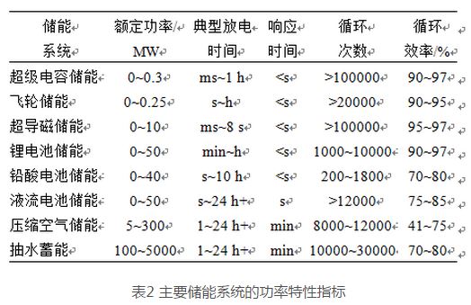 目前,不同國家多采用給定時間尺度風(fēng)電功率最大波動量,作為風(fēng)電波動限制指標(biāo)。該指標(biāo)的時間尺度和波動幅值分別對儲能系統(tǒng)的功率特性和存儲容量提出了要求。因此,儲能系統(tǒng)的類型選取應(yīng)重點關(guān)注儲能系統(tǒng)的功率特性。表2給出了主要儲能系統(tǒng)的功率特性指標(biāo)。