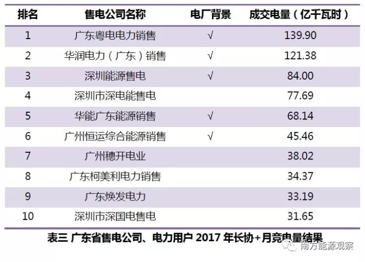 交易電量前十名的售電公司如表三所示,占總成交電量的60.79%,電廠背景售電公司占41.4%,排名第一的粵電占12.62%。