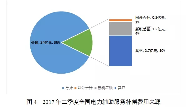 2017年二季度,共收到各派出能源監(jiān)管機構報送的全國除西藏、蒙西地區(qū)外30個?。▍^(qū)、市、地區(qū))電力輔助服務情況數據,涉及電力輔助服務補償的發(fā)電企業(yè)數量共2725家,發(fā)電機組裝機容量共14億千瓦,補償費用共28.19億元,占上網電費總額的0.76%。