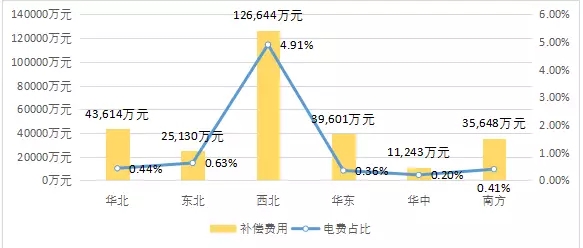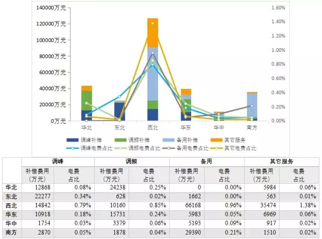 其中,調峰補償力度以西北、東北最高,AGC補償力度以西北、華北最高,備用補償力度以西北、南方最高。總體來看,西北區(qū)域的輔助服務補償力度最大。
