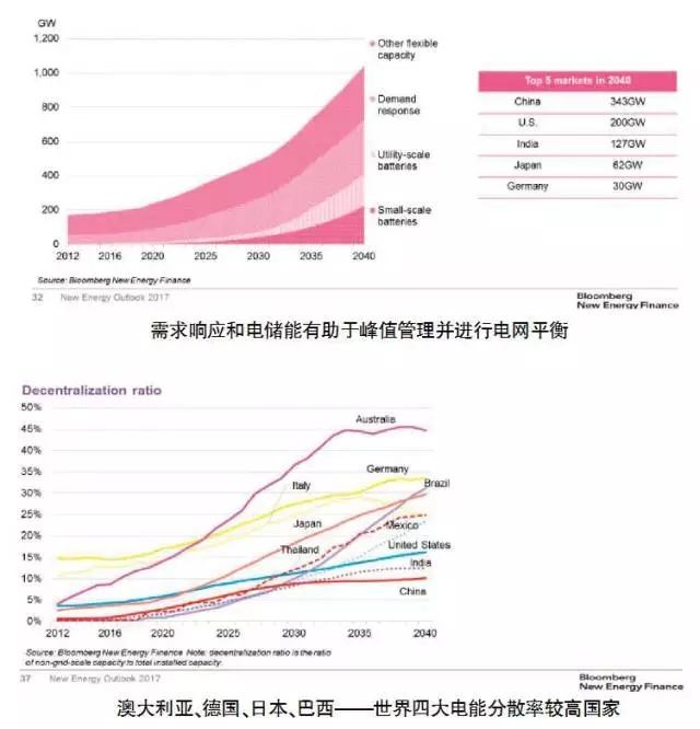 通過“behind-the-meter”電儲能計(jì)劃,將引發(fā)新一輪太陽能發(fā)電產(chǎn)業(yè)的爆發(fā)。在此方面澳大利亞先行一步,該國將在2040年完成總裝機(jī)容量中45%的容量,達(dá)成 “behind-the-meter”電儲能計(jì)劃目標(biāo)。同時(shí),巴西、日本、墨西哥以及德國的電能分散率將超過30%。這也表明,處于電力產(chǎn)業(yè)鏈終端的消費(fèi)者將在電網(wǎng)范疇內(nèi)占據(jù)更多的能源設(shè)備資源。