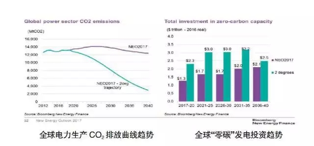 完成這樣的“減排目標(biāo)曲線”,需要世界各國共同遵守巴黎協(xié)定中各國的減排貢獻(xiàn)值目標(biāo)。通過分析發(fā)現(xiàn),在不增加任何附加成本的前提下,完成這樣的減排目標(biāo)是真實(shí)可行的。根據(jù)目前的減排現(xiàn)狀,與達(dá)成“降低2攝氏度”目標(biāo)仍存在一定差距,因此到2040年,全球仍需要約5.3萬億美元的投資來推進(jìn)“零碳”發(fā)電發(fā)展以達(dá)成減排目標(biāo),與此同時(shí),關(guān)于氣候政策的風(fēng)險(xiǎn)也應(yīng)引起關(guān)注。