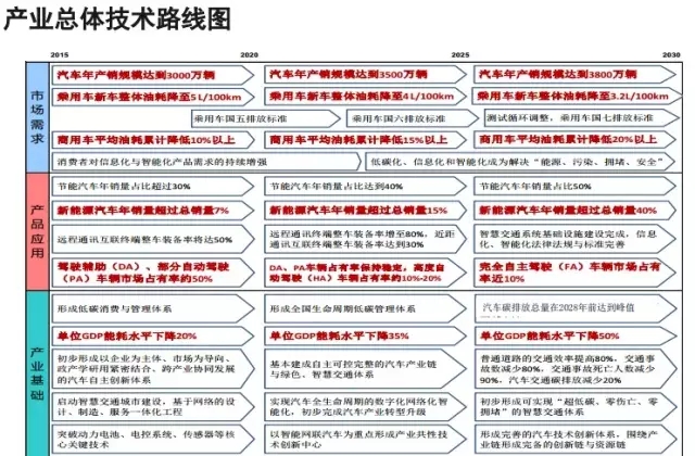 對(duì)于產(chǎn)業(yè)總路線圖可以重點(diǎn)關(guān)注幾組數(shù)據(jù)。以2020年、2025年、2030年為節(jié)點(diǎn),總路線圖重點(diǎn)指出了不同時(shí)間節(jié)點(diǎn)汽車產(chǎn)業(yè)規(guī)模、新能源車銷量占比和智能汽車的市場(chǎng)占有率。