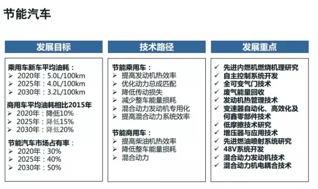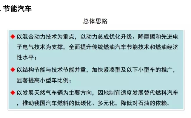 節(jié)能汽車方面總體思路是以混合動(dòng)力為重點(diǎn),以動(dòng)力總成升級(jí),先進(jìn)電子電器為支撐,全面提升傳統(tǒng)燃油車節(jié)能技術(shù)和燃油經(jīng)濟(jì)水平。