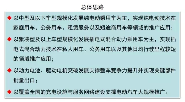 在應(yīng)用領(lǐng)域上,中型及以下車型規(guī)?;l(fā)展純電動(dòng)乘用車為主,實(shí)現(xiàn)純電動(dòng)技術(shù)在家庭用車、公務(wù)用車、租賃服務(wù)以及短途商用車等領(lǐng)域的推廣應(yīng)用;以緊湊型及以上車型規(guī)?;l(fā)展插電式混合動(dòng)力乘用車為主,實(shí)現(xiàn)插電式混合動(dòng)力技術(shù)在私人用車、公務(wù)用車以及其他日均行駛里程較短的領(lǐng)域推廣應(yīng)用,以動(dòng)力電池、驅(qū)動(dòng)電機(jī)突破發(fā)展支撐整車競(jìng)爭(zhēng)力提升并實(shí)現(xiàn)關(guān)鍵部件批量出口,以覆蓋全國(guó)的充電設(shè)施與服務(wù)網(wǎng)絡(luò)建設(shè)支撐電動(dòng)汽車大規(guī)模推廣。
