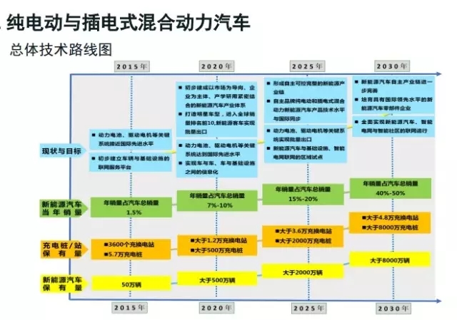 總體技術(shù)路線圖指出,2015-2020 新能源汽車年銷量超過總銷量7%;2020-2025 新能源汽車年銷量超過總銷量15%; 2025-2030 新能源汽車年銷量超過總銷量40%。