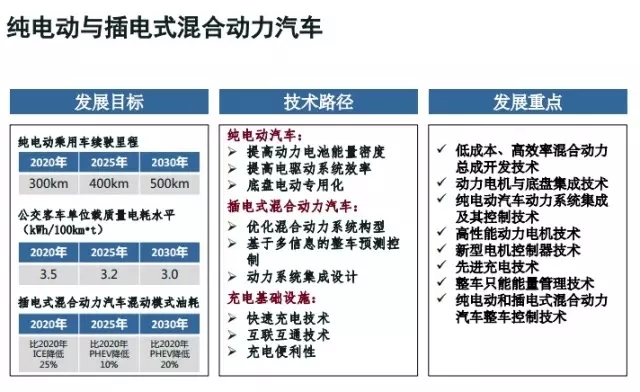 純電動(dòng)和插電式混合動(dòng)力汽車技術(shù)路線重點(diǎn)在于:為了實(shí)現(xiàn)純電動(dòng)汽車和插電式混合動(dòng)力汽車的大批量市場(chǎng)推廣,形成完善的整車、關(guān)鍵總成生產(chǎn)體系和社會(huì)生態(tài)環(huán)境;以降低整車成本、提升整車技術(shù)先進(jìn)性為目標(biāo)、突破先進(jìn)驅(qū)動(dòng)電機(jī)和動(dòng)力電池等關(guān)鍵零部件開發(fā)技術(shù),加快充電設(shè)備技術(shù)研究以充電基礎(chǔ)設(shè)施推廣普及。