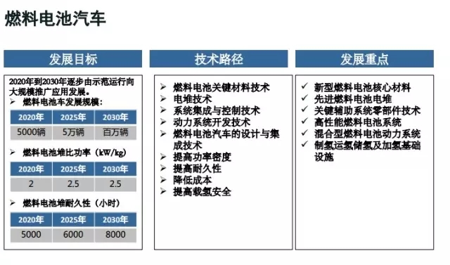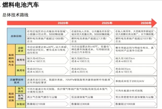 氫燃料電池汽車技術(shù)路線以實(shí)現(xiàn)氫燃料電池汽車產(chǎn)業(yè)化為目標(biāo),開展燃料電池系統(tǒng)、燃料電池堆及材料、車載儲(chǔ)氫與加氫站等關(guān)鍵產(chǎn)業(yè)環(huán)節(jié)技術(shù)與產(chǎn)品攻關(guān)、突破核心技術(shù)、提高性能并進(jìn)一步減低成本,建立并完善燃料電池關(guān)鍵技術(shù)及產(chǎn)業(yè)鏈,燃料電池乘用車與商用車具有較強(qiáng)市場(chǎng)競(jìng)爭(zhēng)力并實(shí)現(xiàn)全面產(chǎn)業(yè)化。