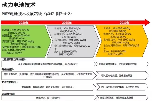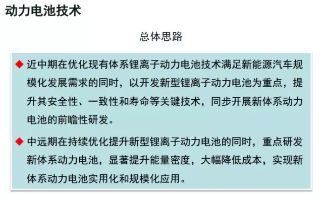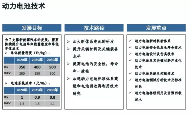 汽車動(dòng)力電池技術(shù)路線以高安全,高比能,長(zhǎng)壽命,低成本為總目標(biāo),以電池材料研發(fā)為核心,以能量型和能量功率兼顧型動(dòng)力電池產(chǎn)品為重點(diǎn),以先進(jìn)制造技術(shù)裝備為保障,遠(yuǎn)近結(jié)合,統(tǒng)籌推進(jìn)新型鋰離子電池和新體系電池的研發(fā)和產(chǎn)業(yè)化,近期主要以提升現(xiàn)有體系電池性能為主,支撐目前新能源汽車技術(shù)快速發(fā)展,中期以開發(fā)新體系電池為主,突破核心技術(shù),遠(yuǎn)期實(shí)現(xiàn)新體系電池的產(chǎn)業(yè)化。