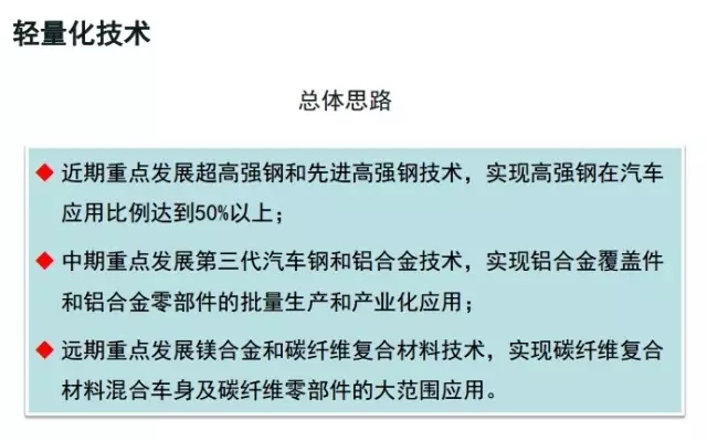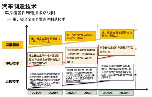 2016年-2020年為第一階段,重點(diǎn)發(fā)展超高強(qiáng)度鋼和先進(jìn)高強(qiáng)度鋼技術(shù),包括材料性能開發(fā),輕量化設(shè)計(jì)方法,成型技術(shù),焊接工藝和測(cè)試評(píng)價(jià)方法等,實(shí)現(xiàn)高強(qiáng)度鋼在汽車應(yīng)用比例達(dá)到50%以上,開展鋁合金板材沖壓制作技術(shù)研究并在車身實(shí)踐,研究不同材料的連接技術(shù)。