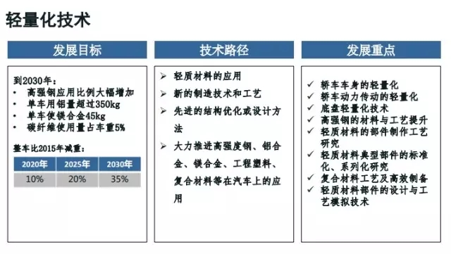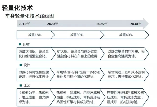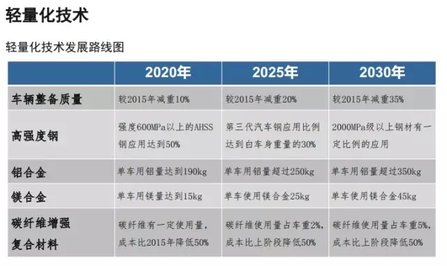 2026年-2030年為第三階段,重點(diǎn)發(fā)展鎂合金和碳纖維復(fù)合材料技術(shù),解決鎂合金及復(fù)合材料循環(huán)再利用問題,實(shí)現(xiàn)碳纖維復(fù)合材料混合車身及碳纖維零部件的大范圍應(yīng)用,突破復(fù)雜零件成型技術(shù)和異種零件連接技術(shù)。