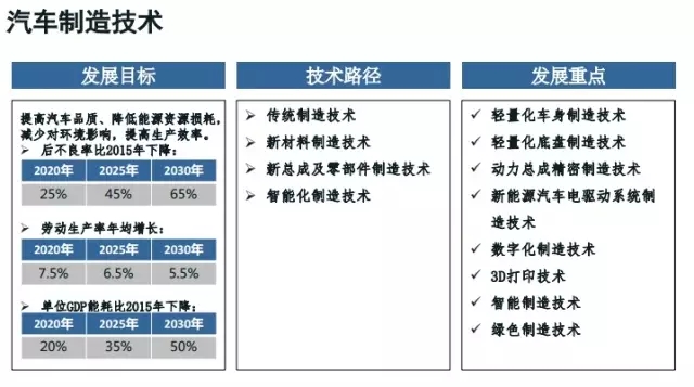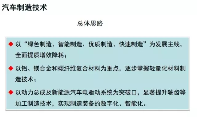 汽車制造技術(shù)路線圖以“綠色制造,智能制造,優(yōu)質(zhì)制造,快速制造”為發(fā)展主線,全面提質(zhì)增效降耗,以鋁鎂合金和碳纖維復(fù)合材料為重點(diǎn),逐步掌握輕量化材料制造技術(shù),以動(dòng)力總成及新能源汽車電驅(qū)動(dòng)系統(tǒng)為突破口,顯著提升軸、齒等零部件的加工制造技術(shù),實(shí)現(xiàn)制造裝備的數(shù)字化、智能化。